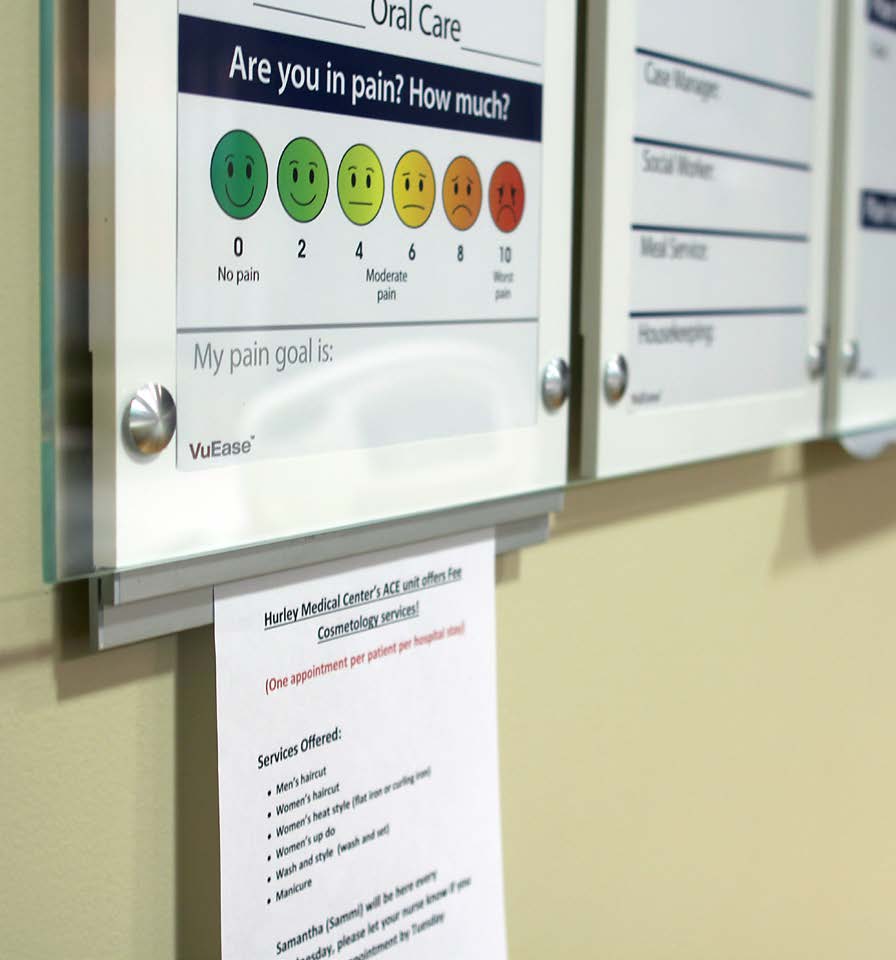 The VuEase® Graphic Inserts are personalized and customized for branding and aesthetic initiatives. Graphic inserts are easily removed and replaced with the EasySlide system. The graphic information and layout can be modified for re-purposing of rooms and patient protocols.